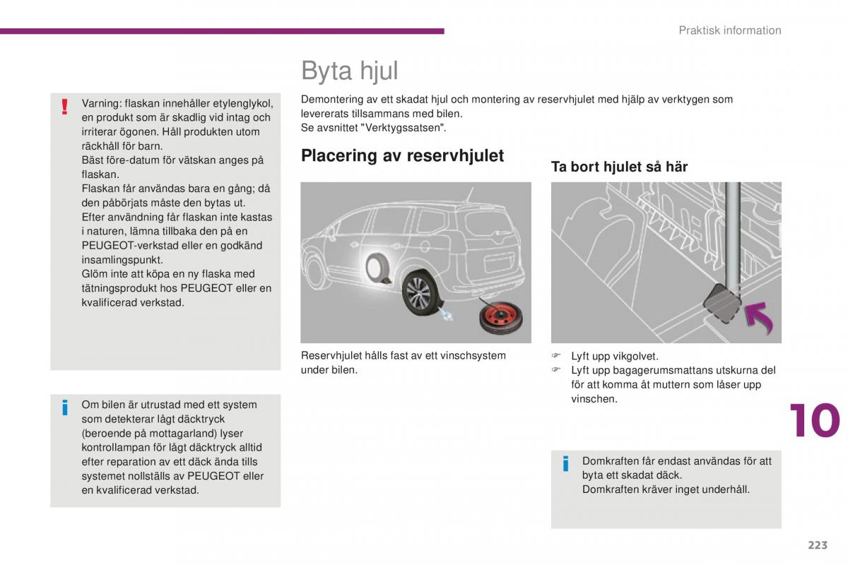 Varning: flaskan innehåller etylenglykol, Demontering av ett skadat hjul och montering av reservhjulet med hjälp av verktygen som