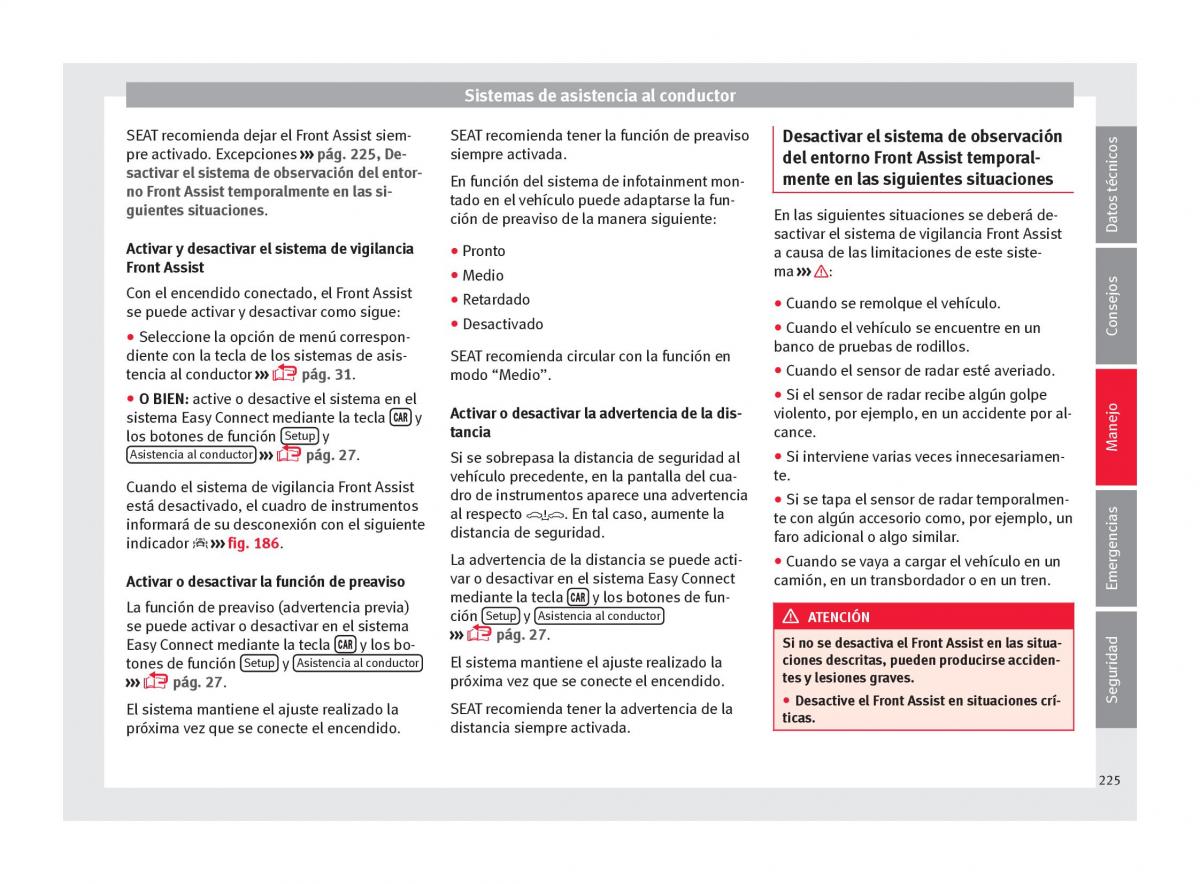 SEAT recomienda dejar el Front Assist siem-SEAT recomienda tener la función de preavisoDesactivar el sistema de observación