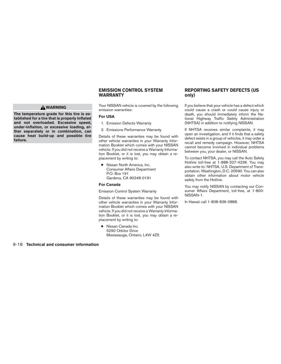 and not overloaded. Excessive speed,1. Emission Defects Warranty(NHTSA)inaddition to notifying NISSAN.