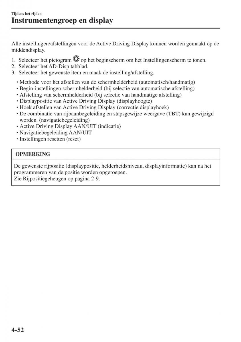 De gewenste rijpositie (displaypositie, helderheidsniveau, displayinformatie) kan na het