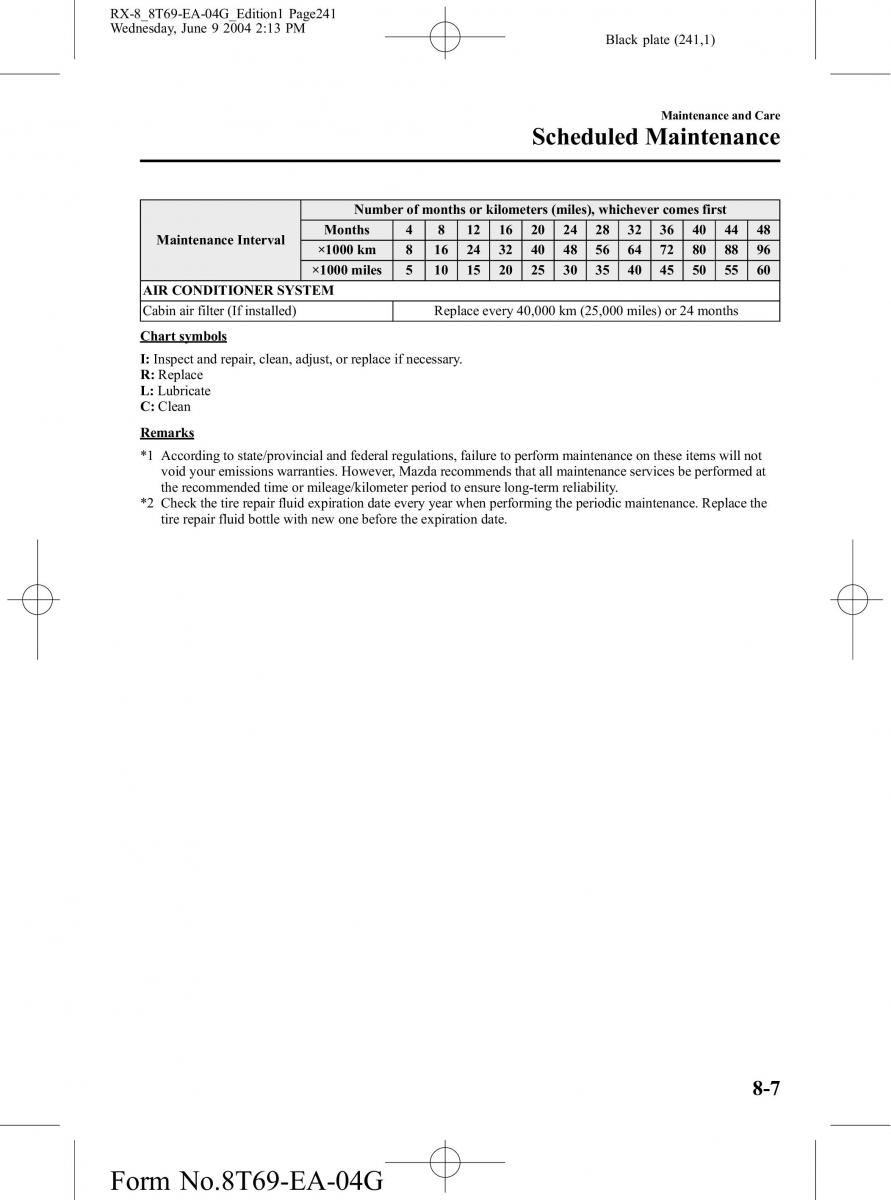 Cabin air filter (If installed)Replace every 40,000 km (25,000 miles) or 24 months