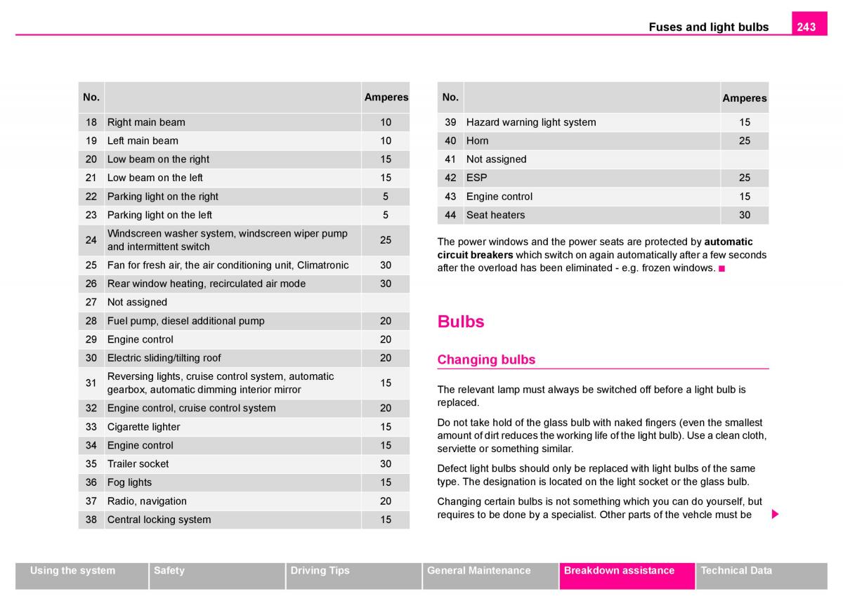 24 Windscreen washer system, windscreen wiper pump 25The power windows and the power seats are protected by automatic