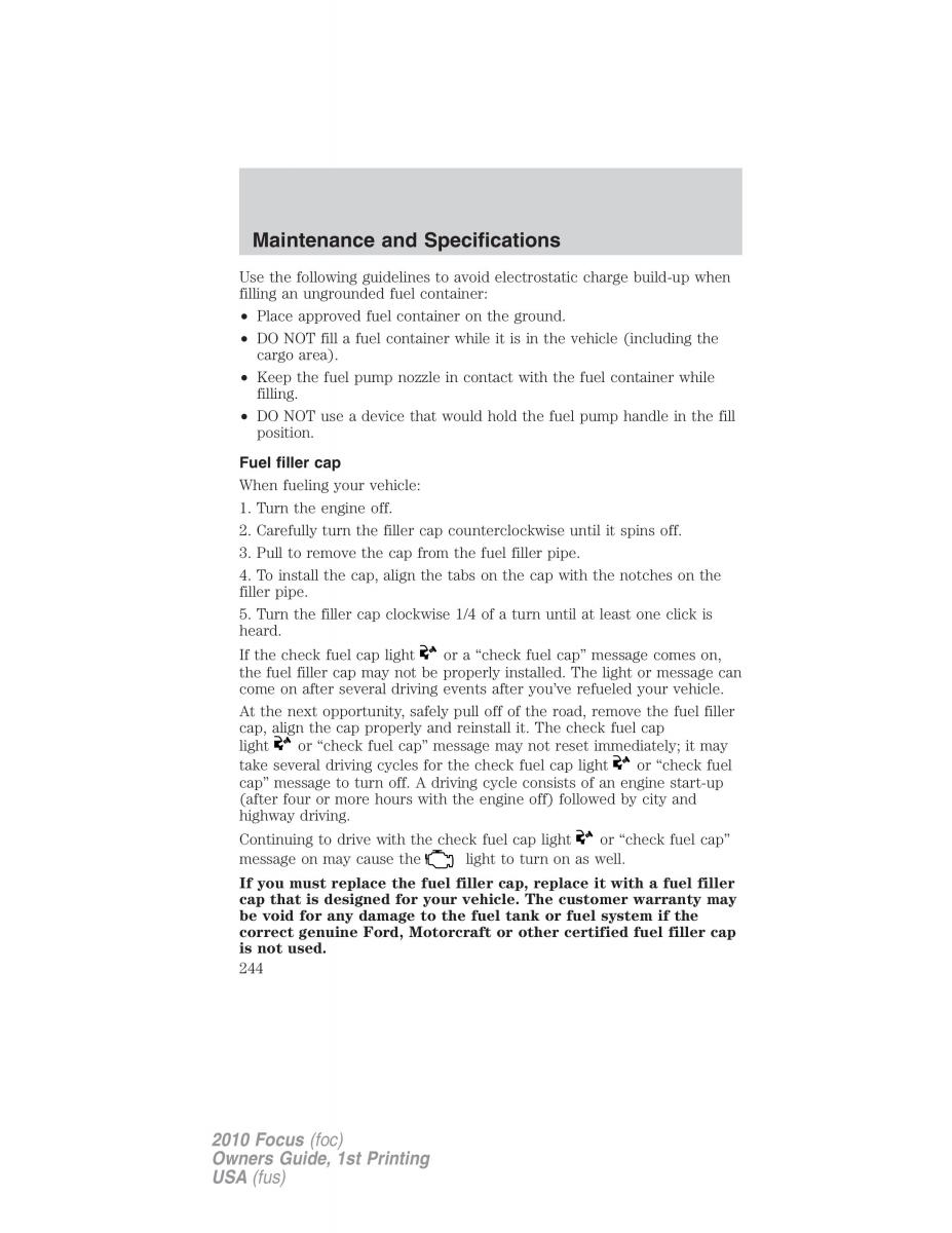 If you must replace the fuel filler cap, replace it with a fuel filler