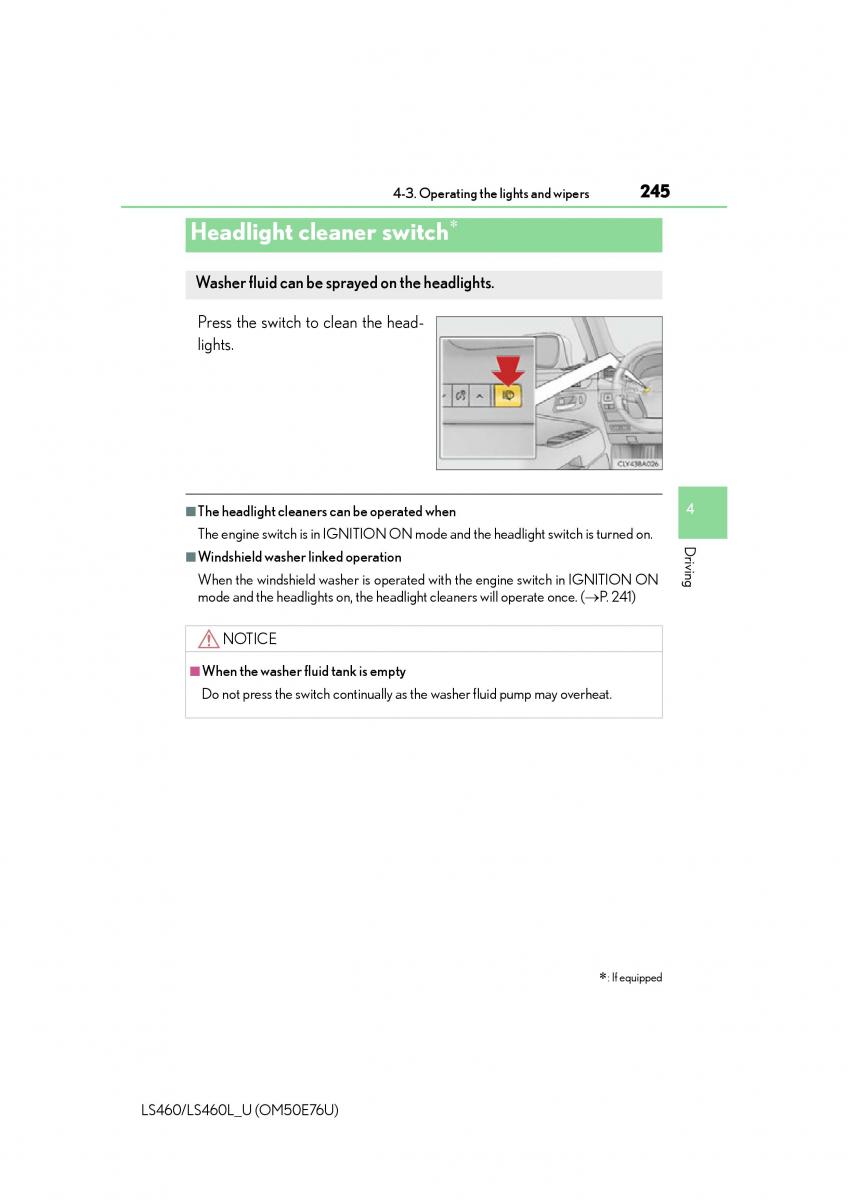 mode and the headlights on, the headlight cleaners will operate once. ( P. 241)
