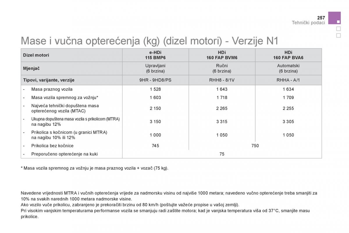 Mase i vučna optereΕenja (kg) (dizel motori) - Verzije N1