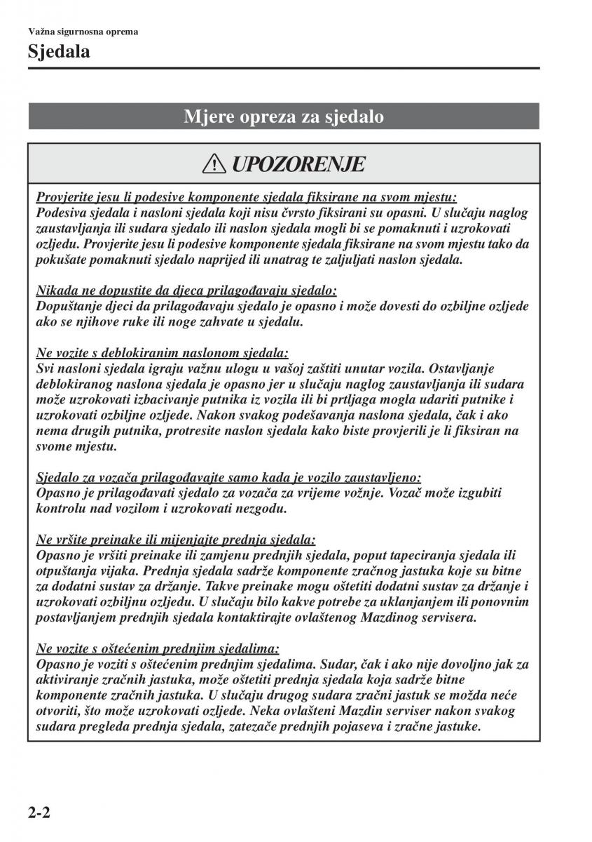 postavljanjem prednjih sjedala kontaktirajte ovlaštenog Mazdinog servisera.