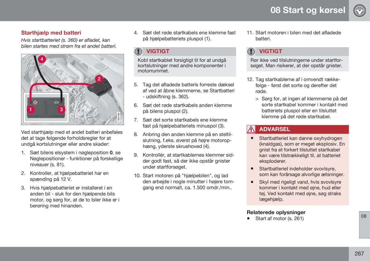 Starthjælp med batteri 4. Sæt det røde startkabels ene klemme fast11. Start motoren i bilen med det afladede