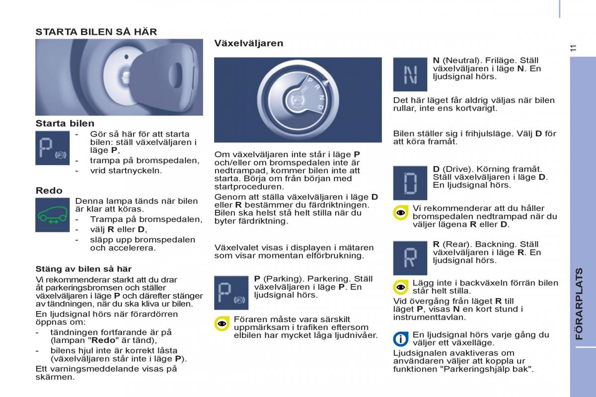 - tändningen fortfarande är på elbilen har mycket låga ljudnivåer. En ljudsignal hörs varje gång du FÖRARPLA