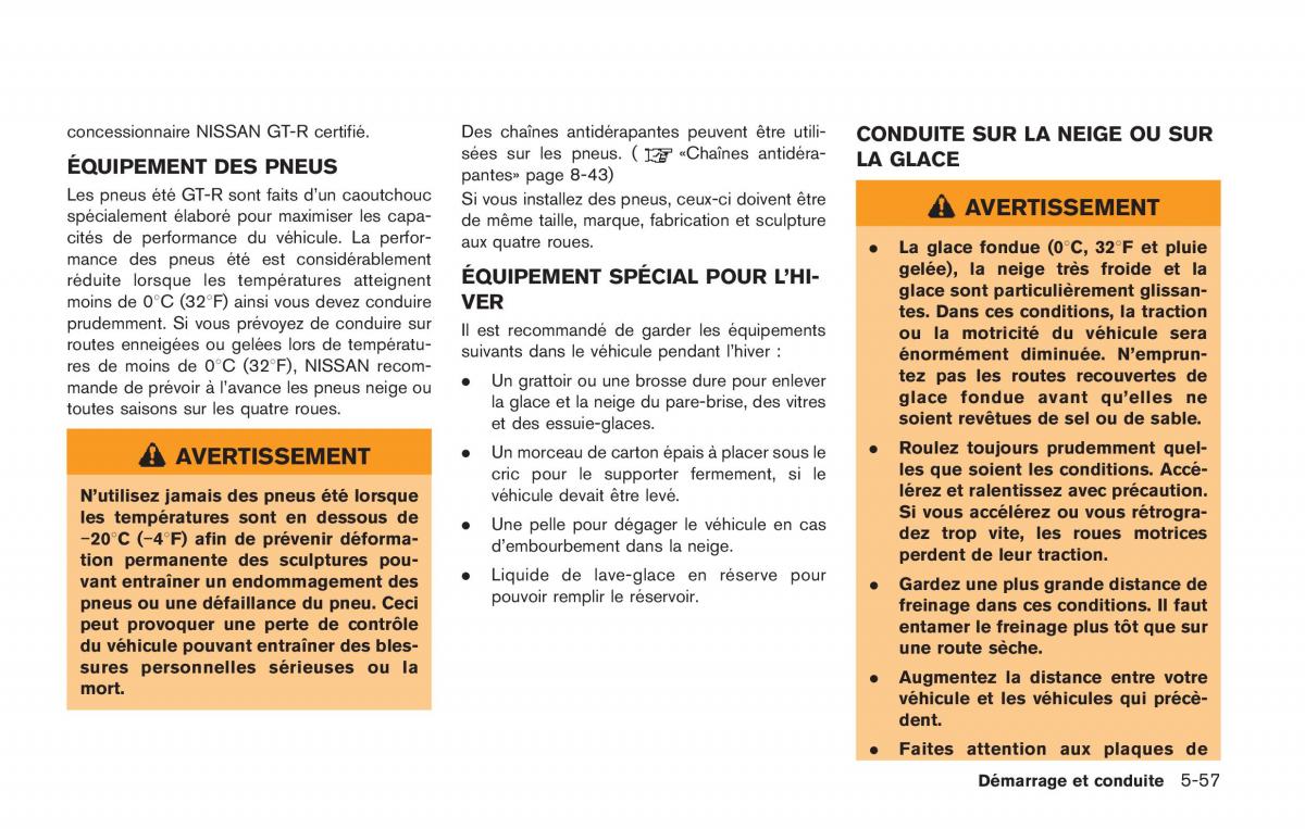 concessionnaire NISSAN GT-R certifie. Des chaınes antiderapantes peuvent etre utili- CONDUITE SUR LA NEIGE OU SUR