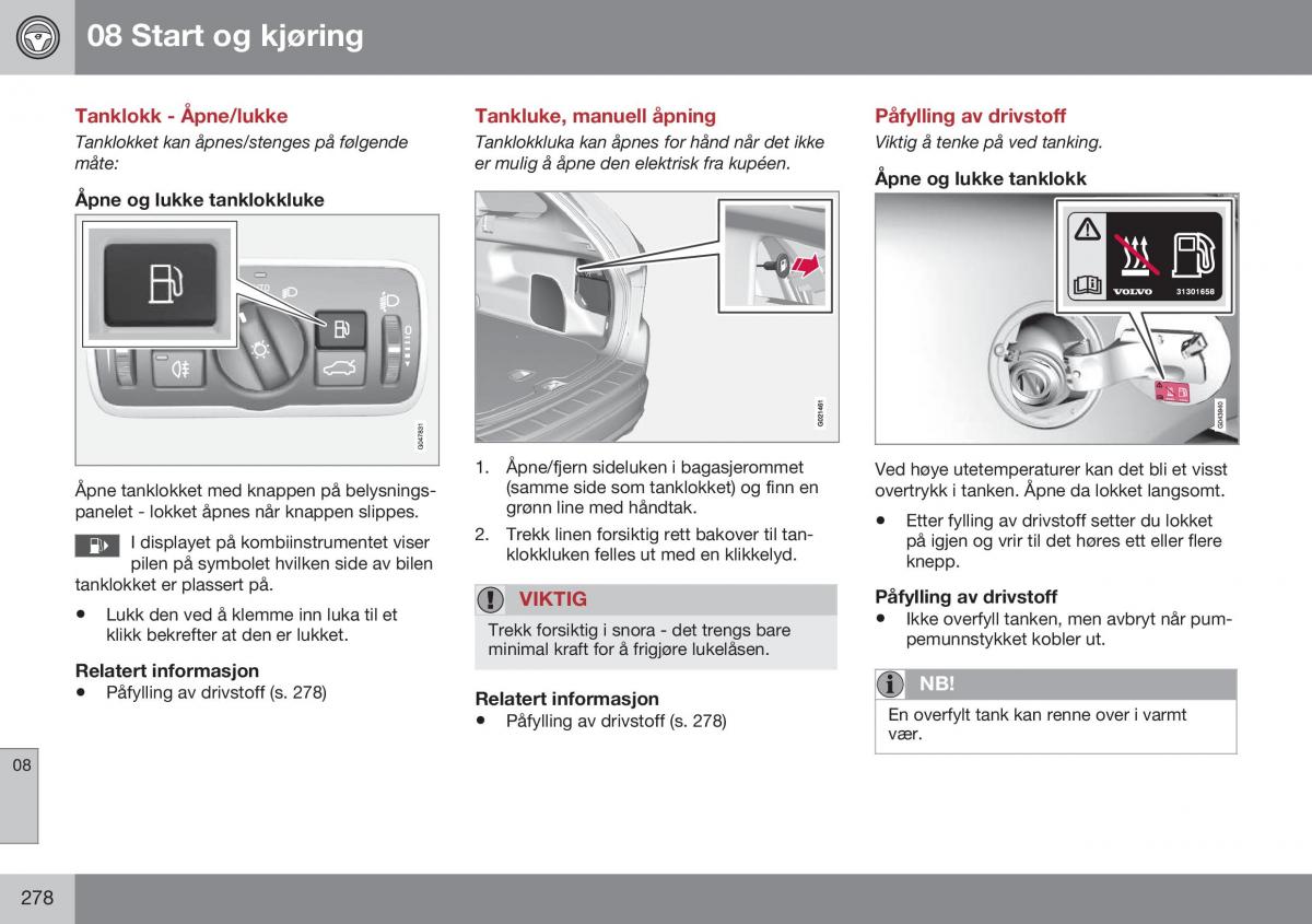 Tanklokket kan åpnes/stenges på følgendeTanklokkluka kan åpnes for hånd når det ikkeViktig å tenke på ved tanking.