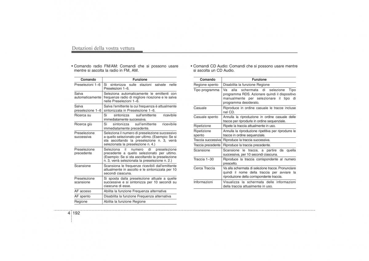 • Comando radio FM/AM: Comandi che si possono usare• Comandi CD Audio:Comandi che si possono usare mentre