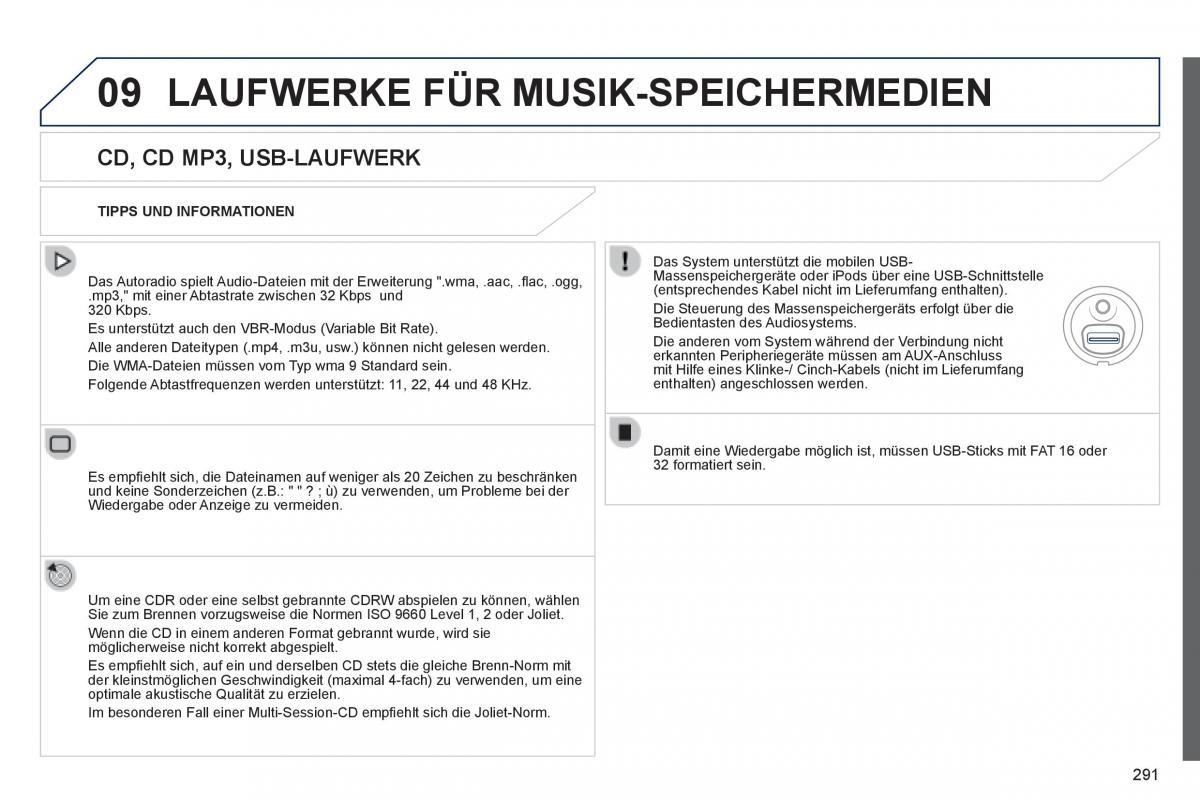 Das Autoradio spielt Audio-Dateien mit der Erweiterung ".wma, .aac, .fl ac, .ogg, Massenspeichergeräte oder iPods über eine USB-Schnittstelle