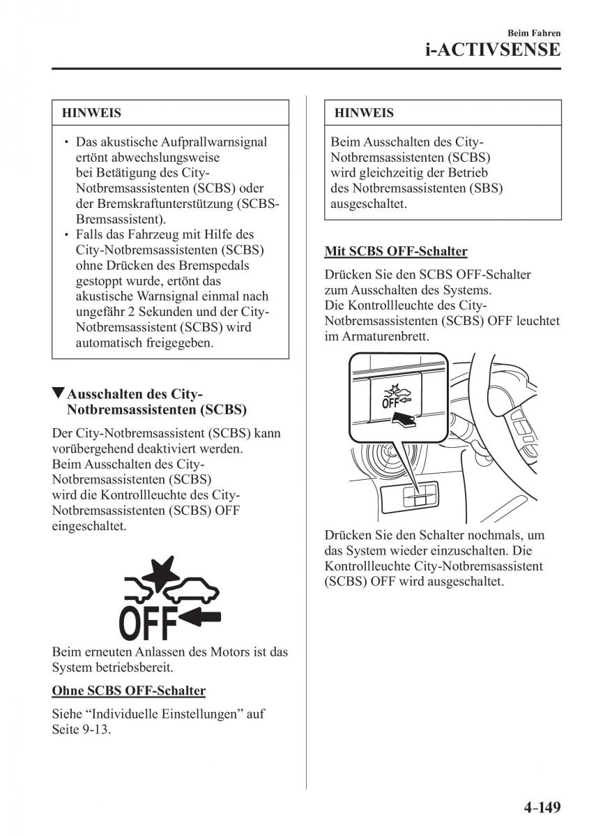 City-Notbremsassistenten (SCBS) SCBS Mit OFF-Schalter