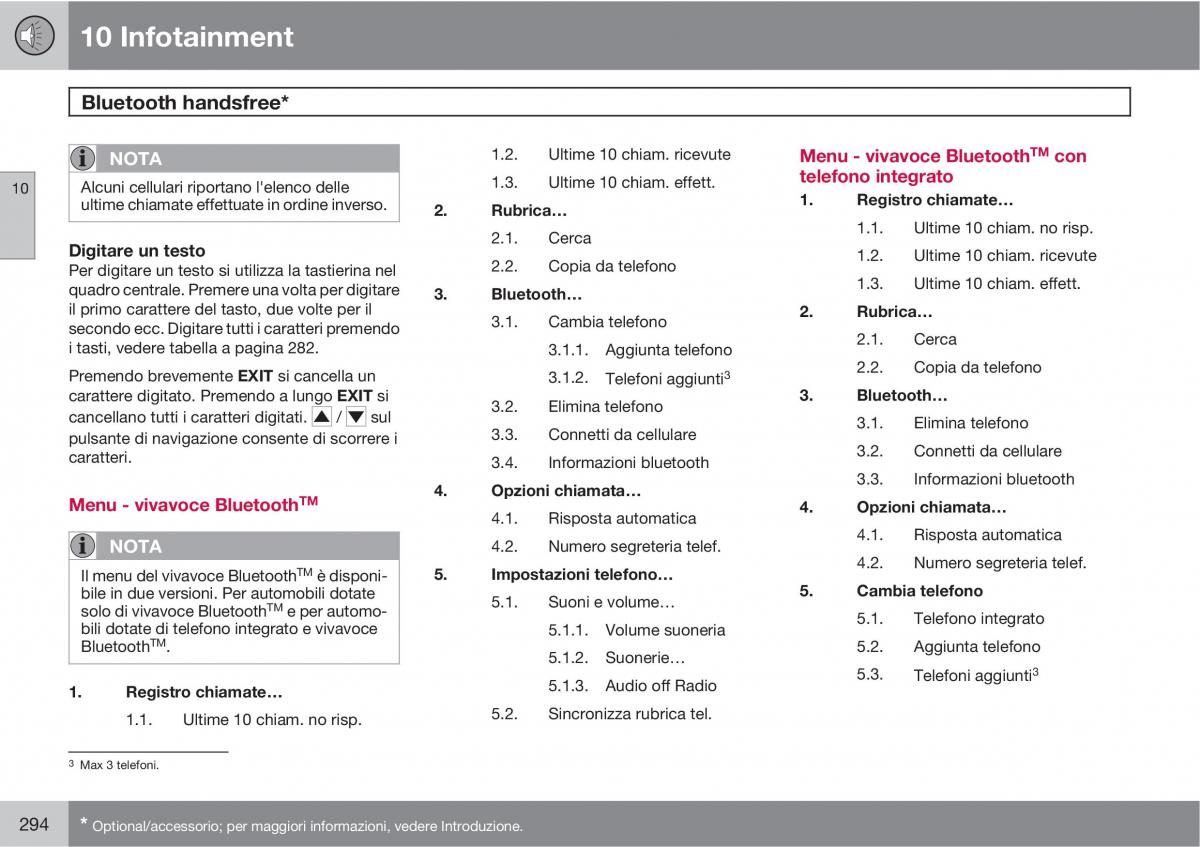 NOTA 1.2. Ultime 10 chiam. ricevute Menu - vivavoce BluetoothTM con