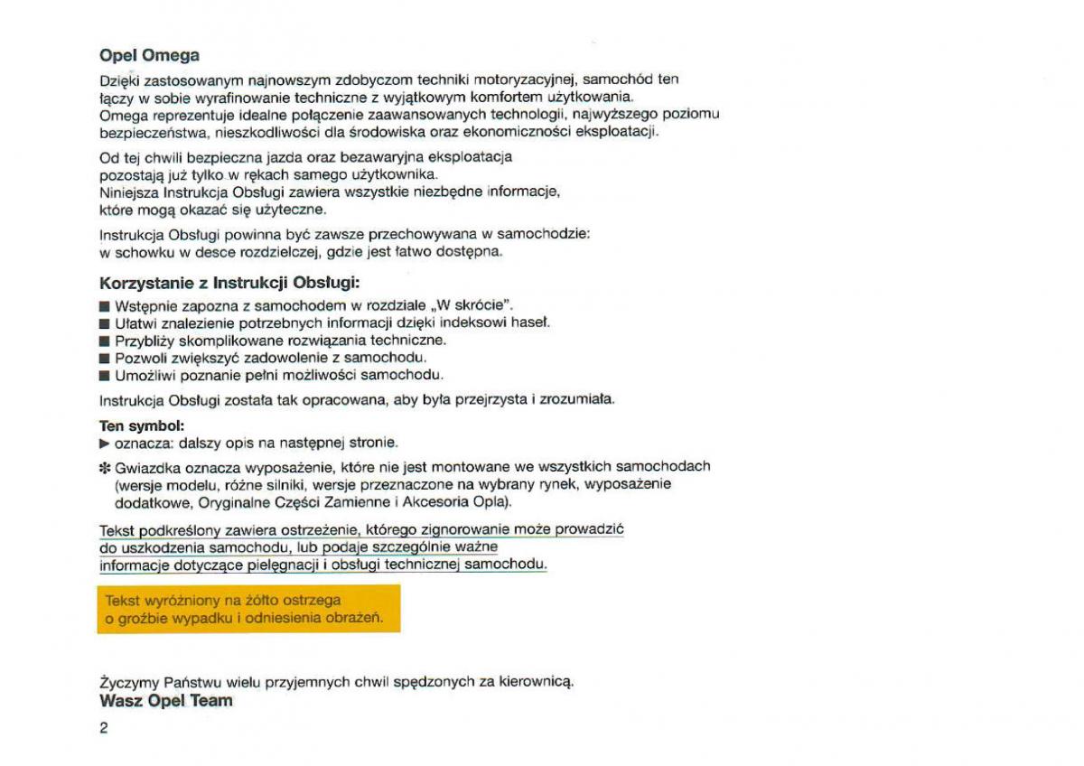 owners manual Opel Omega - year of production: 1999, 2000, 2001, 2002, 2003 - Opel Omega Vauxhall Omega B FL instrukcja obslugi PL