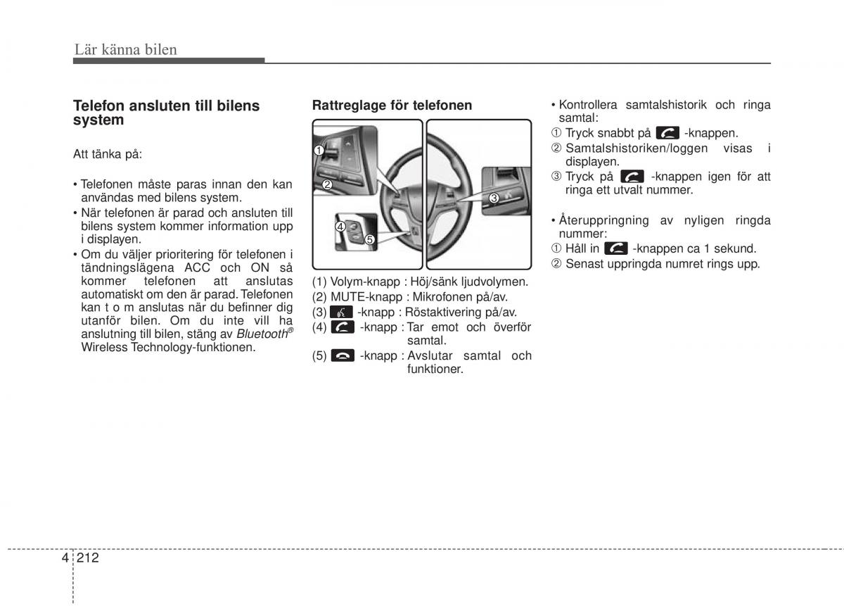 Telefon ansluten till bilensRattreglage för telefonen• Kontrollera samtalshistorik och ringa