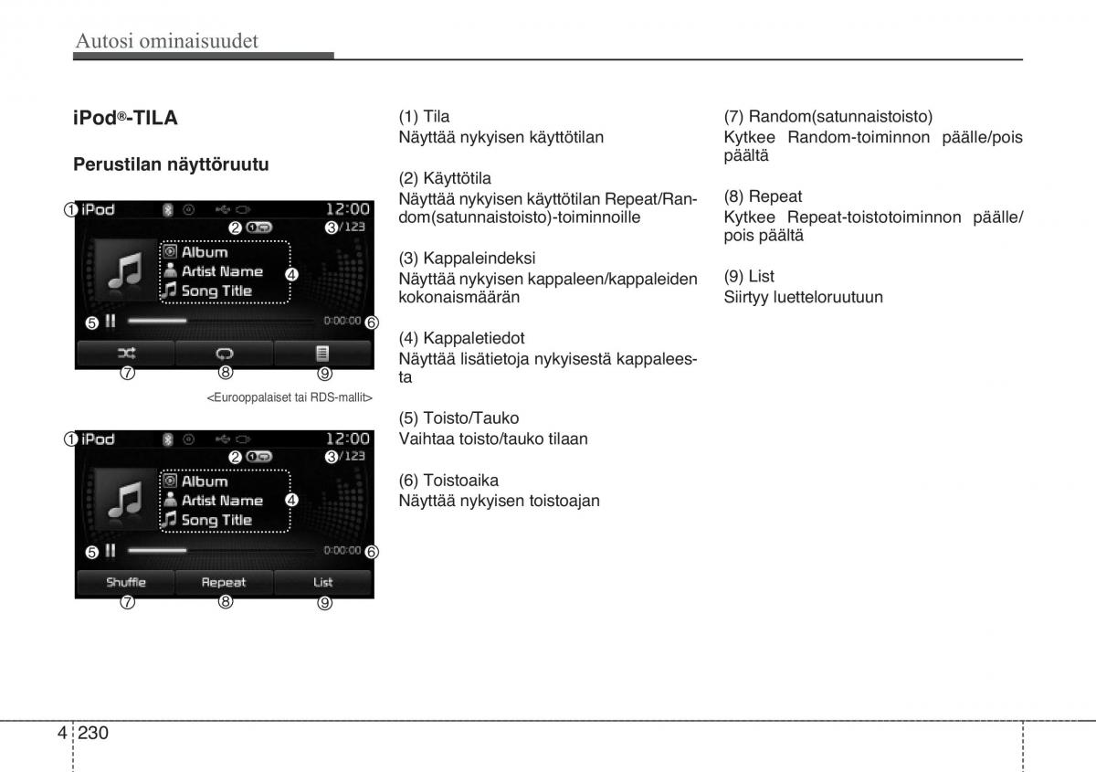 iPod -TILA Näyttää nykyisen käyttötilan Kytkee Random-toiminnon päälle/pois