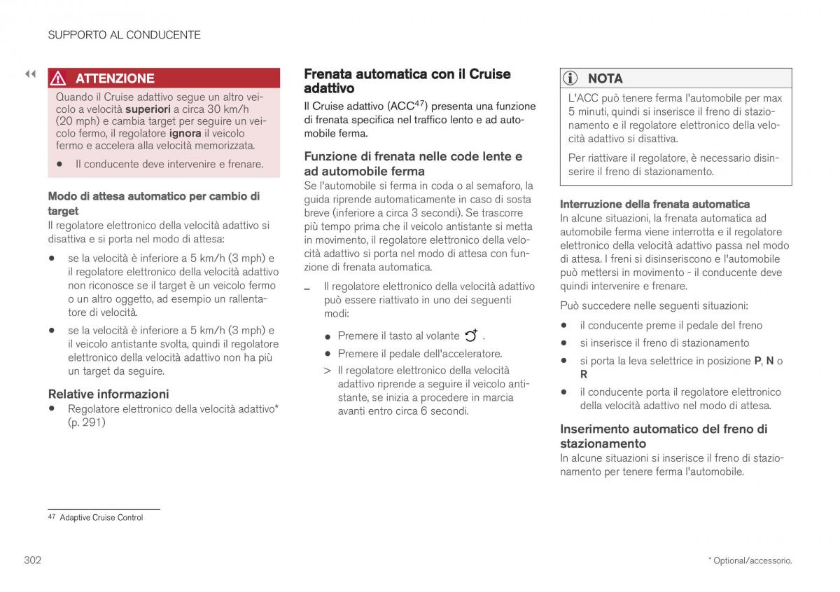 colo a velocità superiori a circa 30 km/h Il Cruise adattivo (ACC) presenta una funzione 5 minuti, quindi si inserisce il freno di stazio-