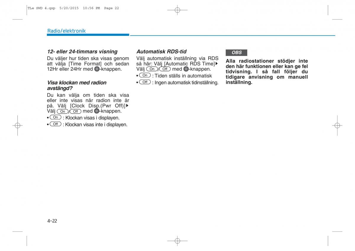 12- eller 24-timmars visning Automatisk RDS-tid OBS