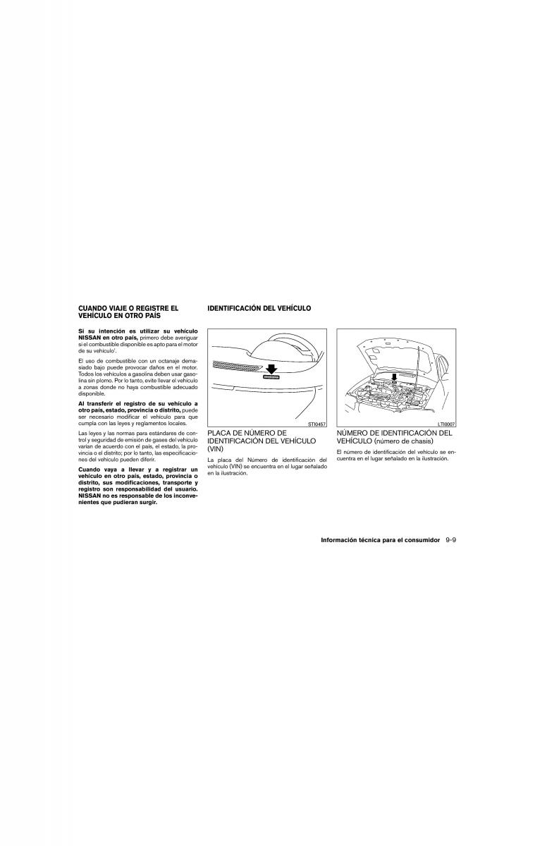 CUANDOVIAJEOREGISTREEL IDENTIFICACIÓN DEL VEHÍCULO VEHÍCULOENOTROPAÍS Si su intención es utilizar su vehículo NISSANenotropaís, primero debe averiguar si el combustibledisponibleesaptoparaelmotor de su vehículo’. El uso de combustible con un octanaje dema- siado bajo puede provocar daños en el motor. Todoslosvehículosagasolinadebenusargaso- lina sin plomo. Por lo tanto, evite llevar el vehículo a zonas donde no haya combustible adecuado disponible. Al transferir el registro de su vehículo a otropaís,estado,provinciaodistrito,puede ser necesario modificar el vehículo para que cumpla con las leyes y reglamentos locales. STI0457 LTI0007 Las leyes y las normas para estándares de con-PLACADENÚMERODE NÚMERODEIDENTIFICACIÓNDEL trol y seguridad de emisióndegasesdelvehículoIDENTIFICACIÓNDELVEHÍCULOVEHÍCULO(númerodechasis) varían de acuerdo con el país, el estado, la pro-(VIN) vincia o el distrito; por lo tanto, las especificacio- El número de identificación del vehículo se en- nes del vehículo pueden diferir. La placa del Número de identificación delcuentra en el lugar señalado en la ilustración. Cuando vaya a llevar y a registrar unvehículo (VIN) se encuentra en el lugar señalado vehículo en otro país, estado, provincia oen la ilustración. distrito, sus modificaciones, transporte y registro son responsabilidad del usuario. NISSANnoesresponsabledelosinconve- nientes que pudieran surgir. Información técnica para el consumidor 9-9 323 00000 Tiida 2013 OM3S 0C11X0 Domestico