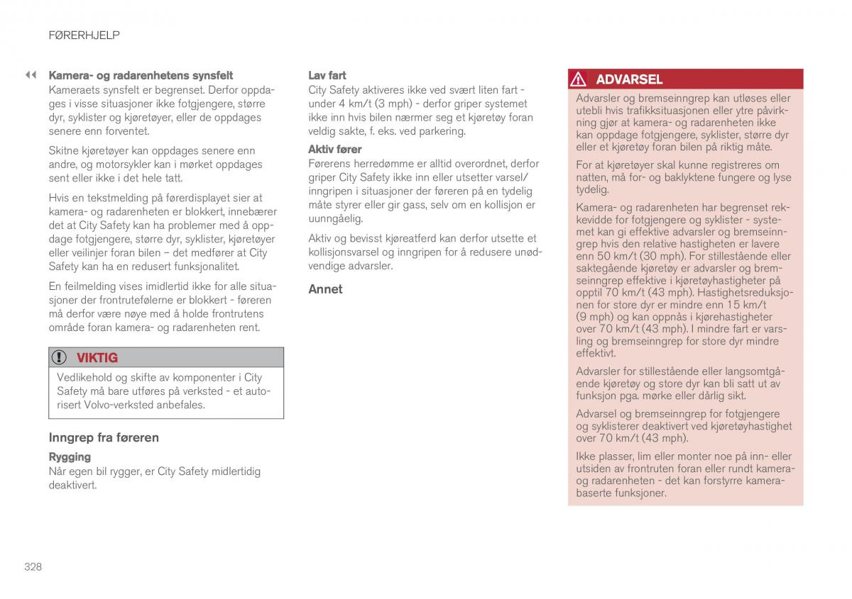 Kameraets synsfelt er begrenset. Derfor oppda-City Safety aktiveres ikke ved svært liten fart -Advarsler og bremseinngrep kan utløses eller
