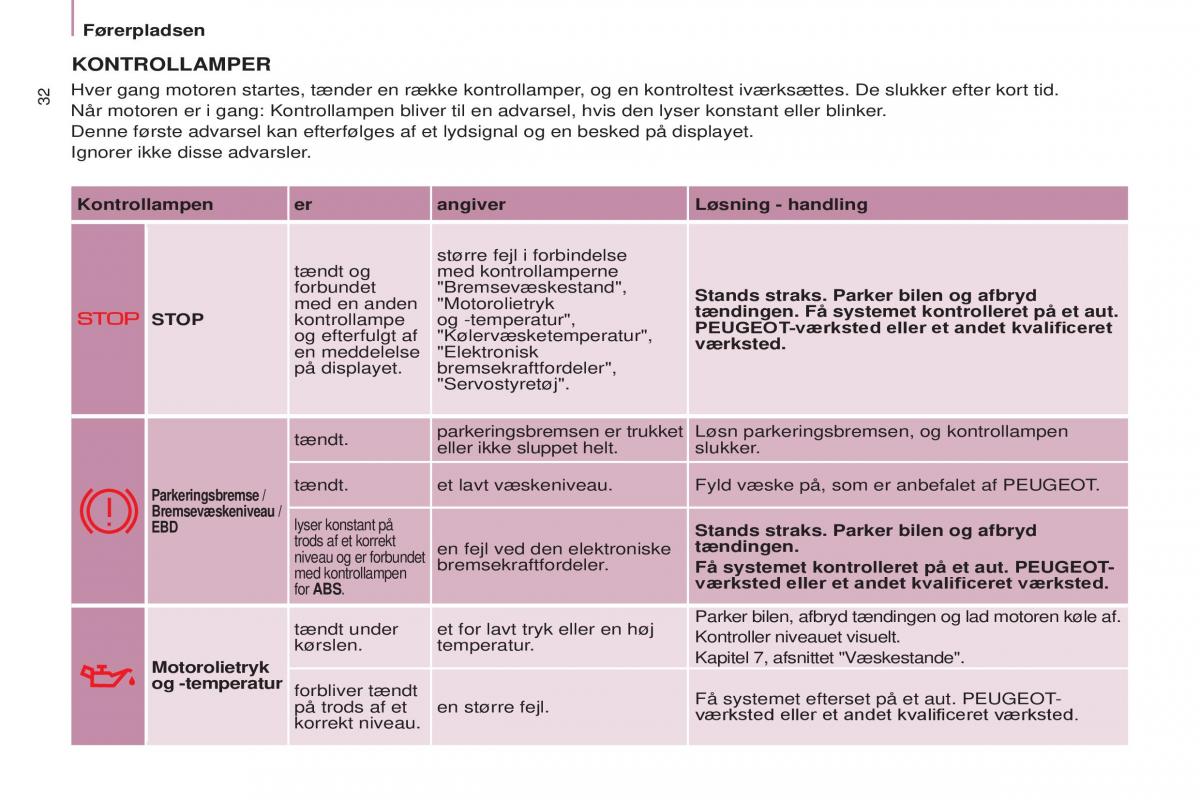 32Hver gang motoren startes, tænder en række kontrollamper, og en kontroltest iværksættes. De slukker efter kort tid.