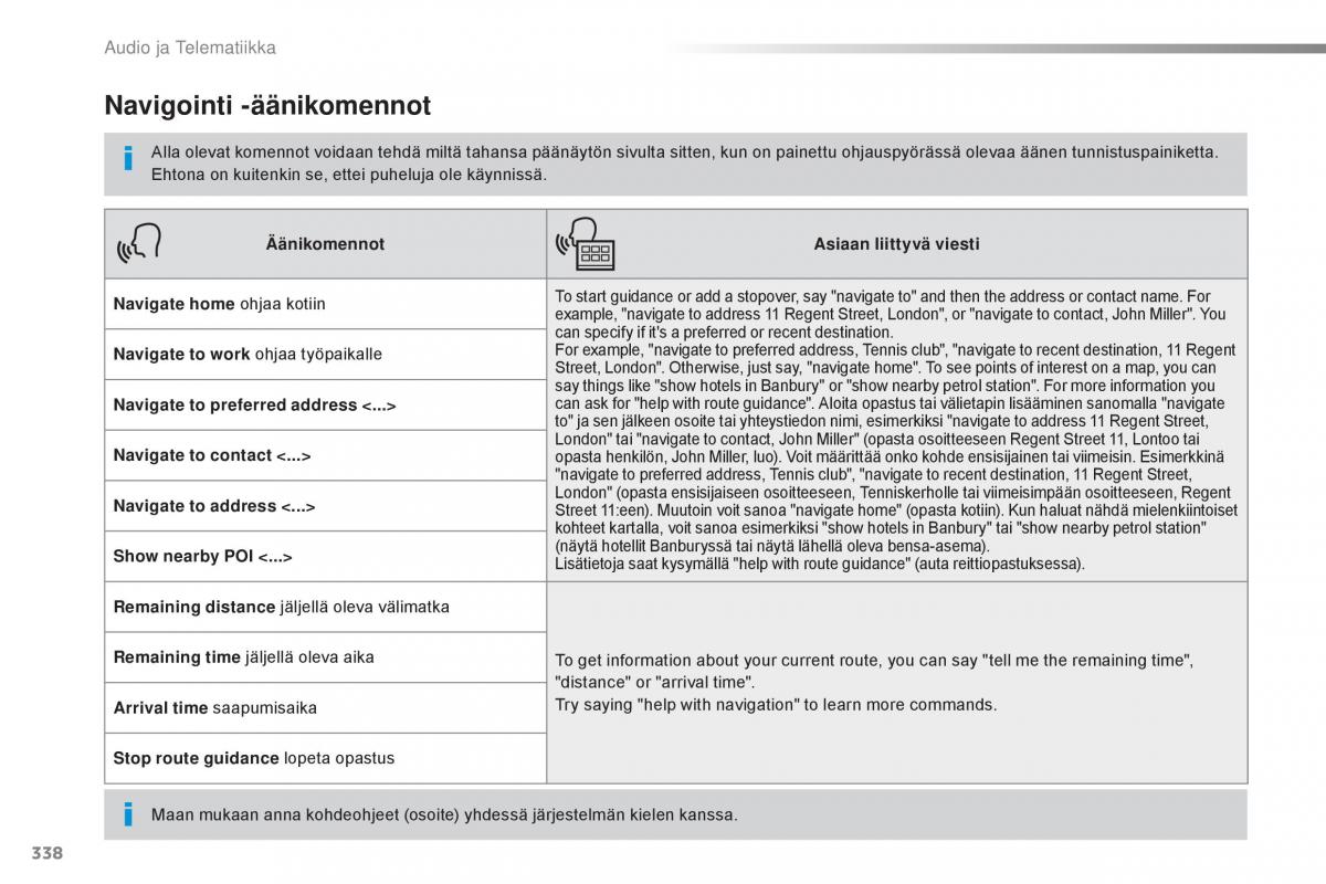 Navigate home ohjaa kotiin To start guidance or add a stopover, say "navigate to" and then the address or contact name. For