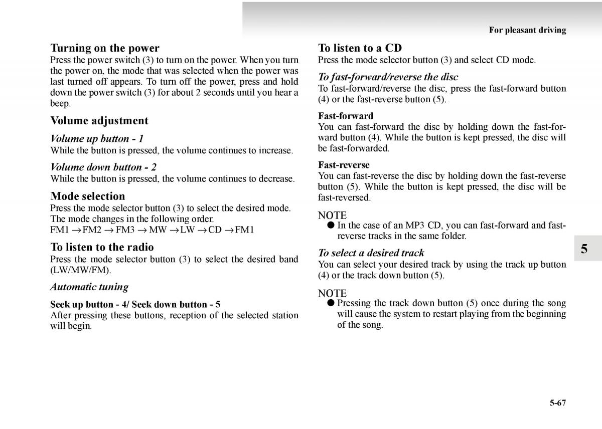 To listen to the radio To select a desired track 5