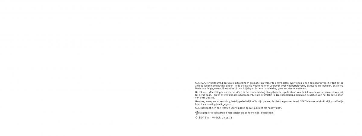 ATTENTIE de gewenste informatie kunt vinden. Herdruk, weergave of vertaling, hetzij gedeeltelijk of in zijn geheel, is niet toegestaan tenzij SEAT hiervoor uitdrukkelijk schriftelijk