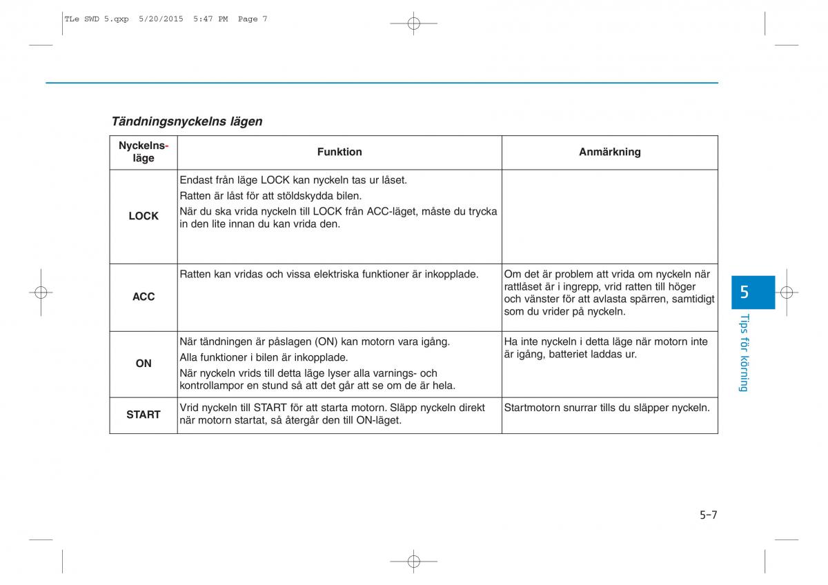 Tändningsnyckelns lägen
