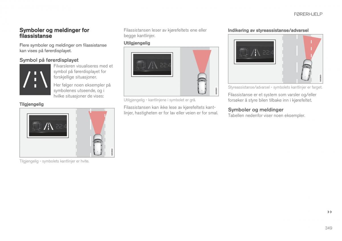 Symboler og meldinger for Filassistansen leser av kjørefeltets ene ellerIndikering av styreassistanse/advarsel