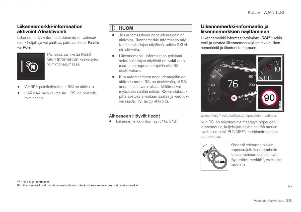 • Liikennemerkki-informaatio* (s. 348) Kun RSI on rekisteröinyt määrätyn nopeuden lii-