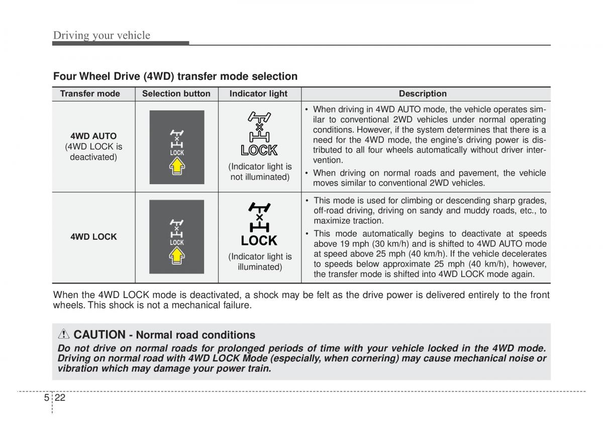 Do not drive on normal roads for prolonged periods of time with your vehicle locked in the 4WD mode.