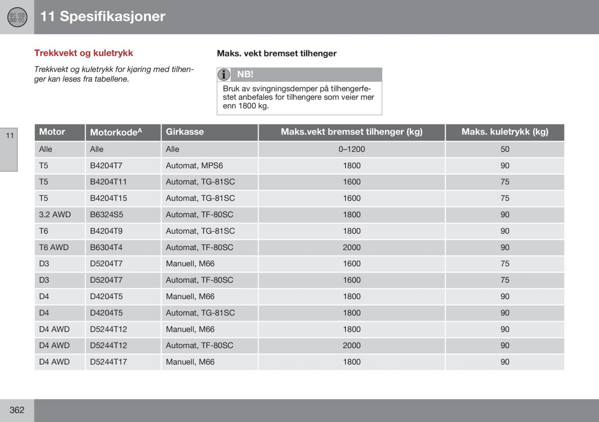 Motor Motorkode Girkasse Maks.vekt bremset tilhenger (kg) Maks. kuletrykk (kg)