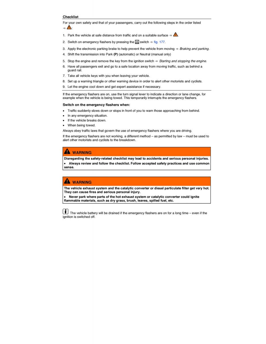 2. Switch on emergency flashers by pressing the switch ⇒ fig. 177.