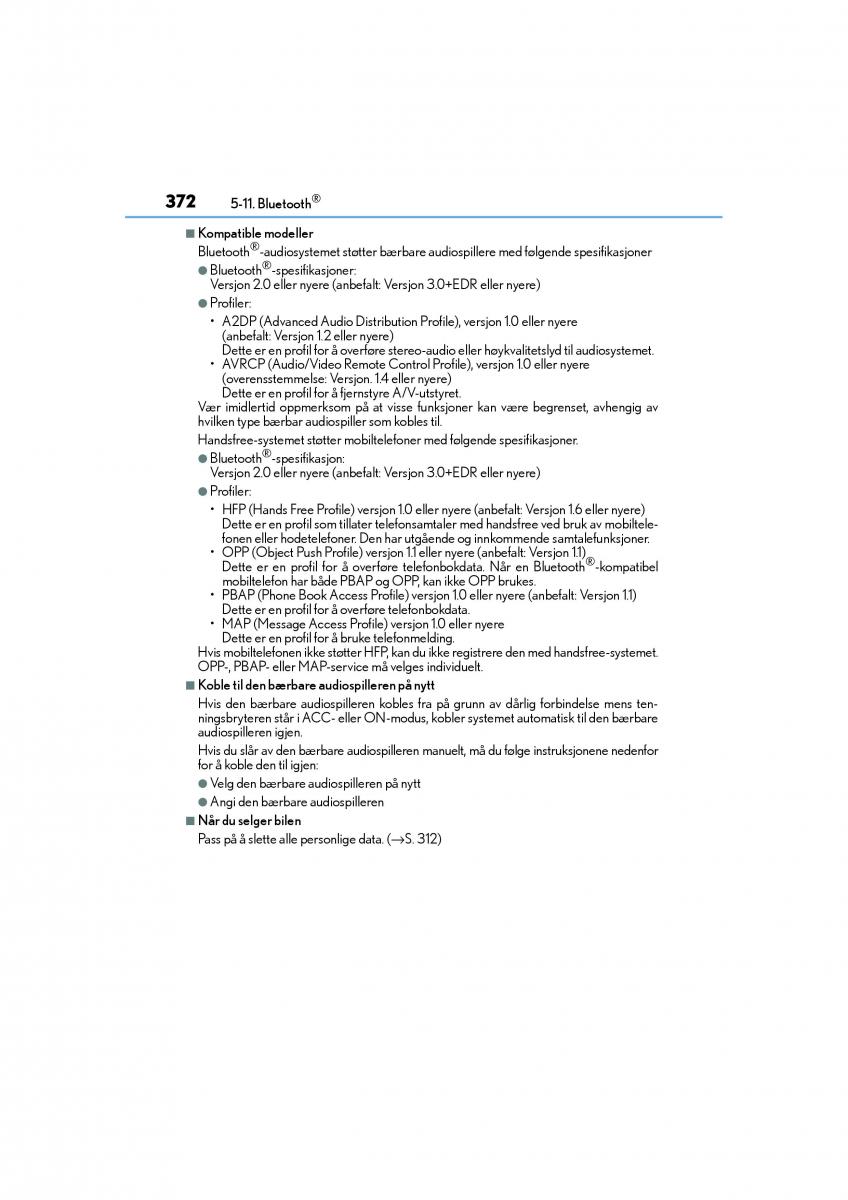 HFP (Hands Free Profile) versjon 1.0 eller nyere (anbefalt: Versjon 1.6 eller nyere)