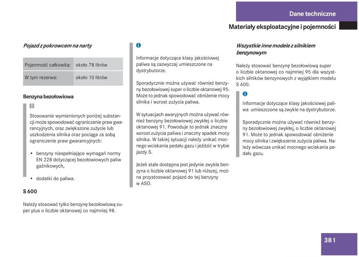 from owners manual to the vehicle Mercedes S, year of production 1998 - 2005: