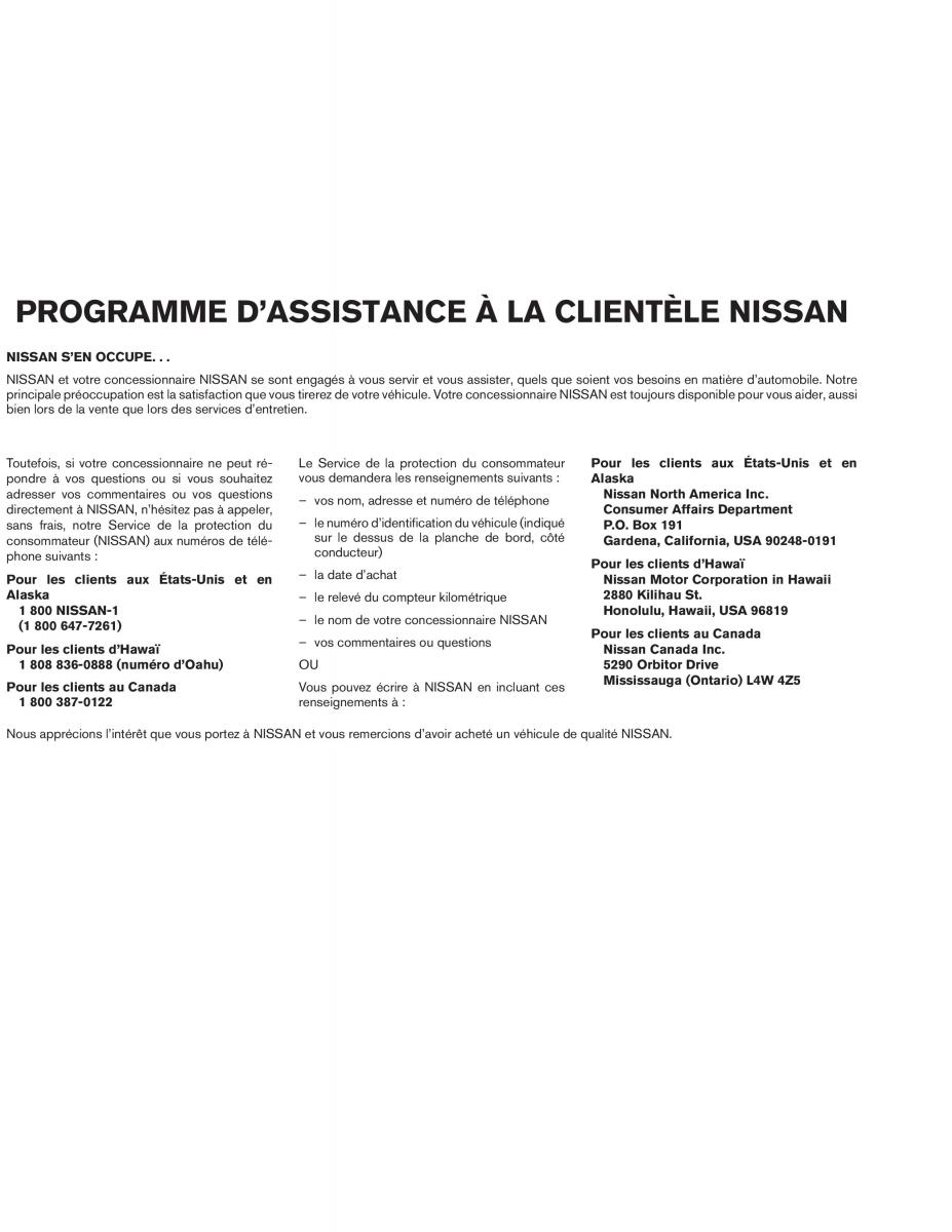 Nousapprécions l’intérêt que vous portez à NISSAN et vous remercions d’avoir acheté un véhicule de qualité NISSAN.