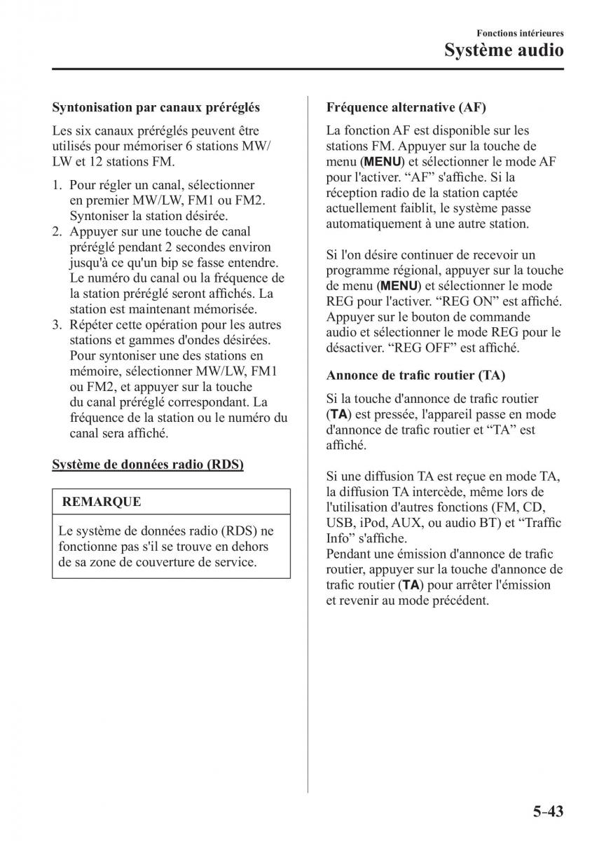 Le système de données radio (RDS) ne USB, iPod, AUX, ou audio BT) et “ Traffi c