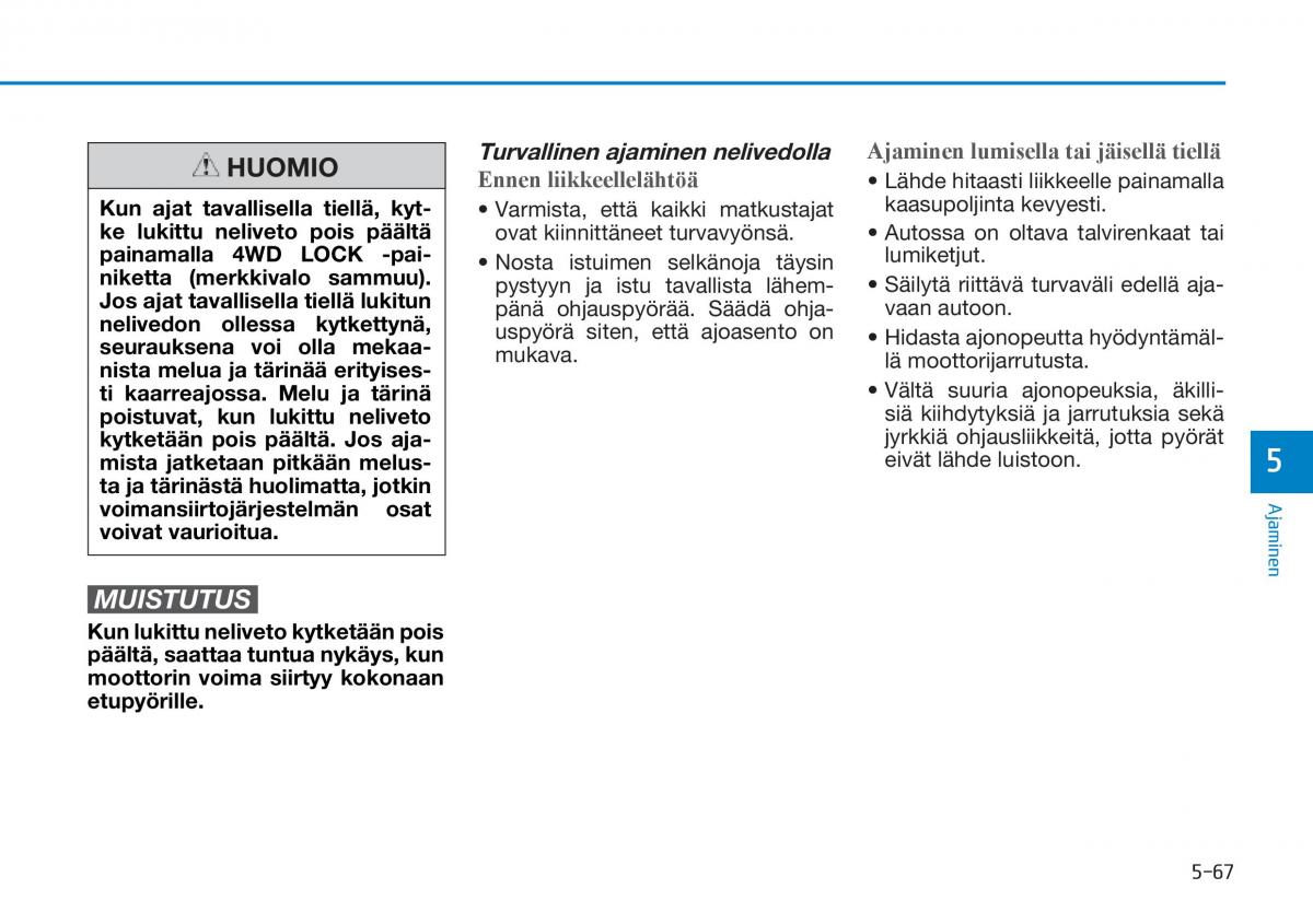 HUOMIO Turvallinen ajaminen nelivedolla Ajaminen lumisella tai jäisellä tiellä
