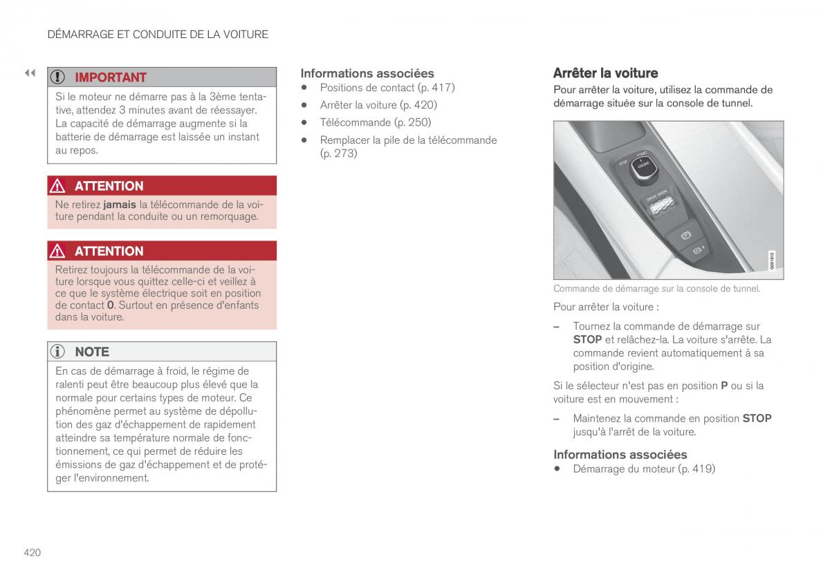 Arrêter la voiture (p. 420) démarrage située sur la console de tunnel.
