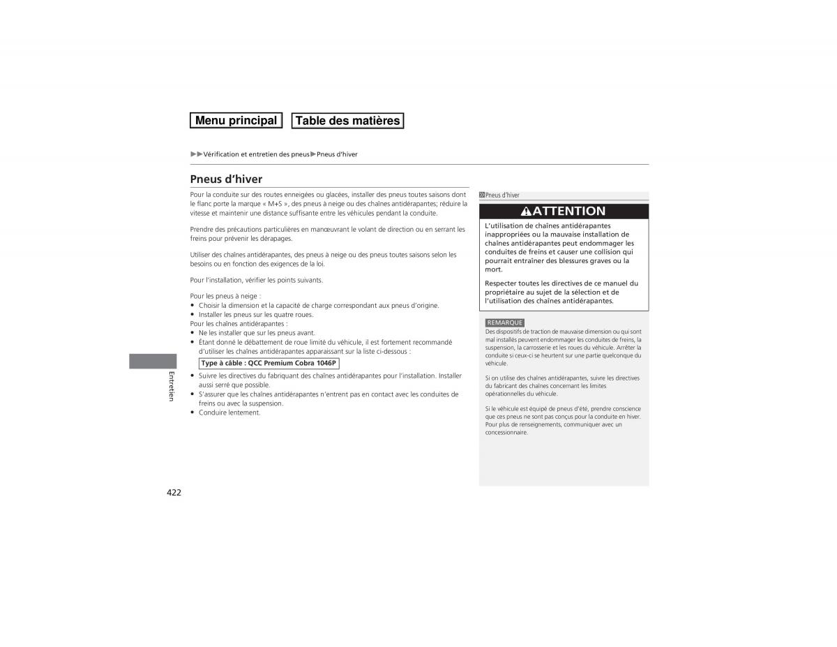 Entretie• Suivre les directives du fabriquant des chaînes antidérapantes pour l’installation. Installer Si on utilise des chaînes antidérapantes, suivre les directives