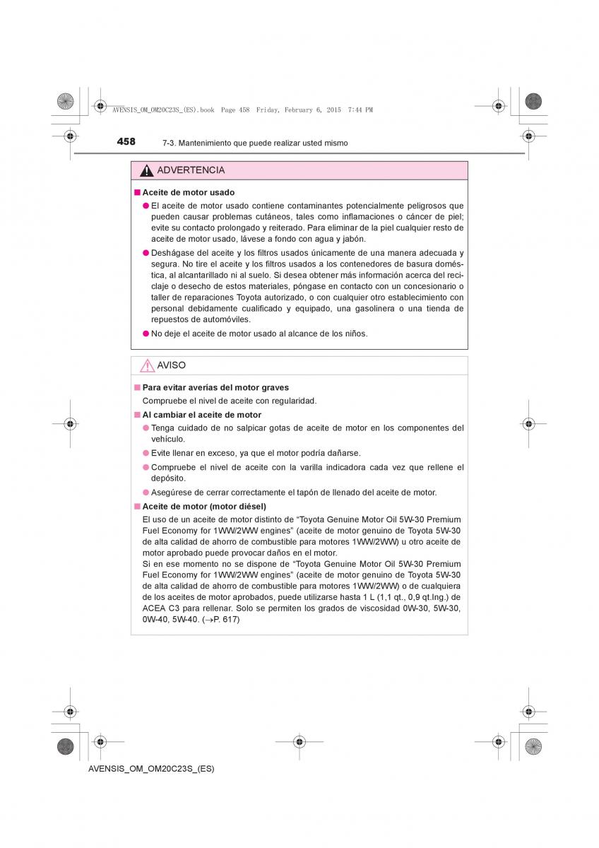 AVENSIS_OM_OM20C23S_(ES).book Page 458 Friday, February 6, 2015 7:44 PM