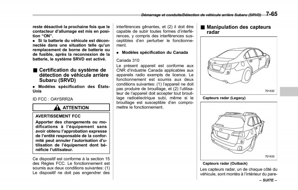 Démarrage et conduite/Détection de véhicule arrière Subaru (SRVD)7-65