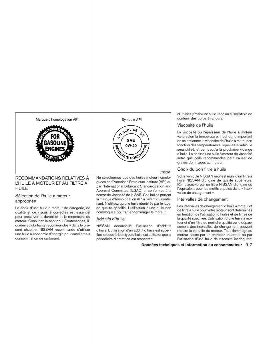 L’HUILE À MOTEUR ET AU FILTRE À guéesparl’AmericanPetroleumInstitute(API)ouhuile NISSAN d’origine de qualité supérieure.