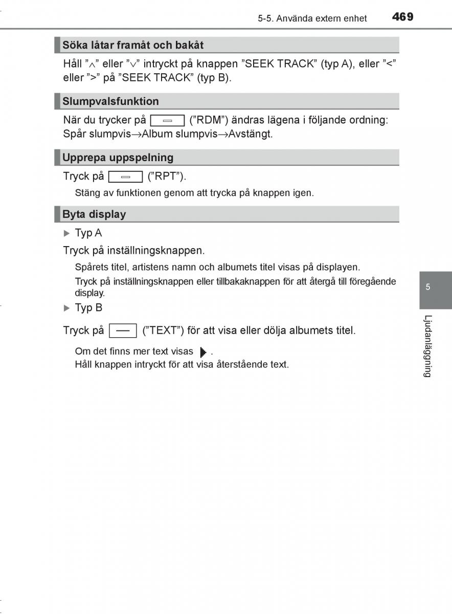Håll ”∧” eller ”∨” intryckt på knappen ”SEEK TRACK” (typ A), eller ”<”