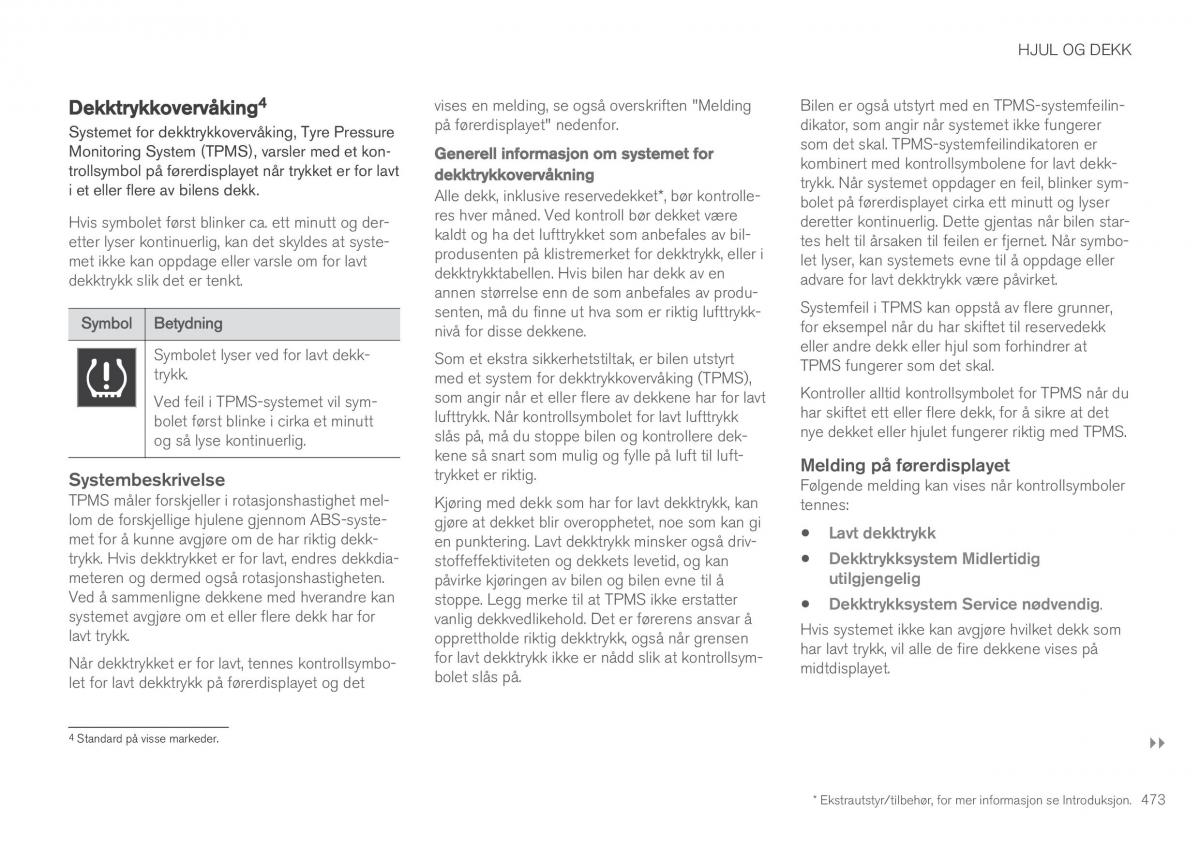 Monitoring System (TPMS), varsler med et kon- Generell informasjon om systemet for som det skal. TPMS-systemfeilindikatoren er