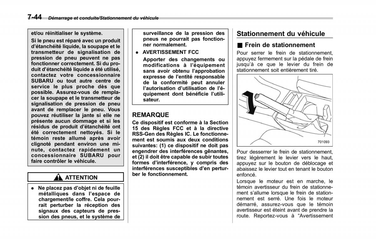 transmetteur de signalisation de . AVERTISSEMENT FCC Pour serrer le frein de stationnement, ATTENTION