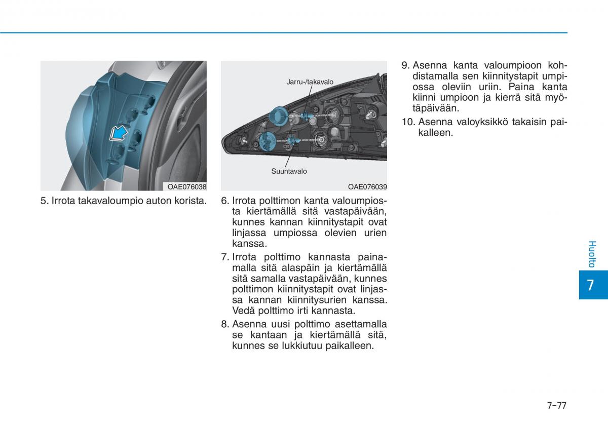 5. Irrota takavaloumpio auton korista. 6. Irrota polttimon kanta valoumpios-