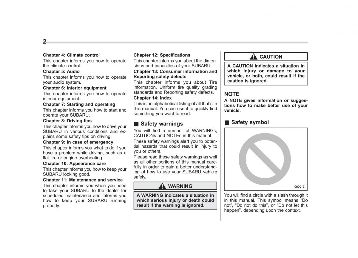 the climate control. sions and capacities of your SUBARU.A CAUTION indicates a situation in